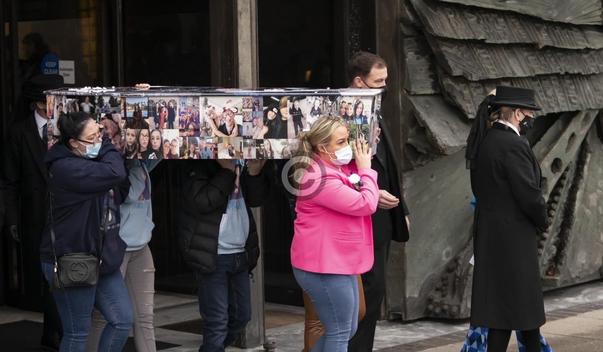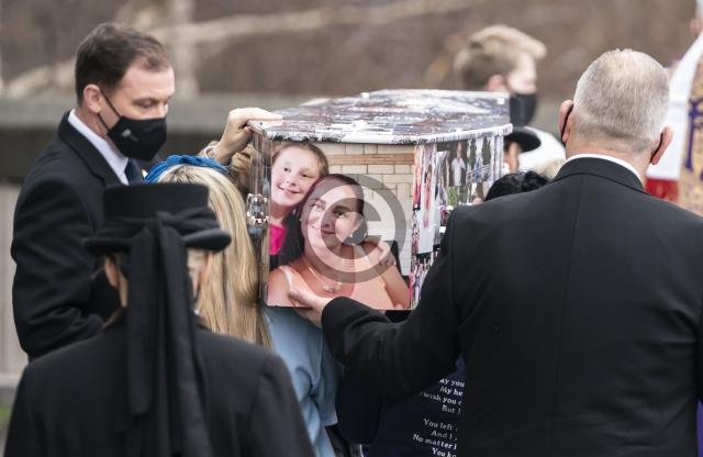 Photographs of the youngster covered her coffin, which was brought to her funeral service at Liverpool Metropolitan Cathedral in a white horse-drawn carriage on Thursday morning.