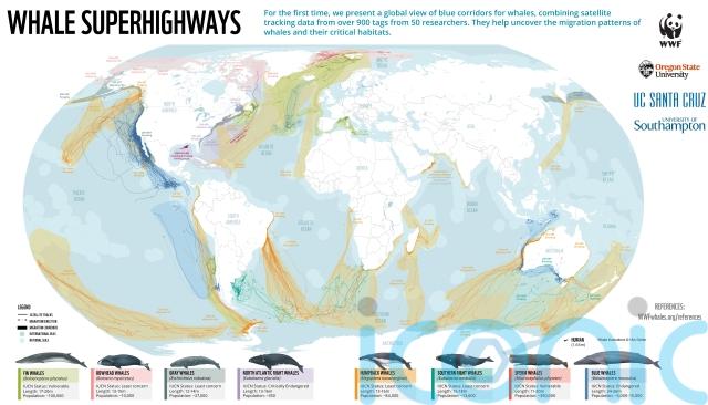 It draws on satellite tracking data from 845 whales collected over the past 30 years to map how species, including humpbacks, fin and blue whales, travel through oceans from breeding to key feeding grounds.