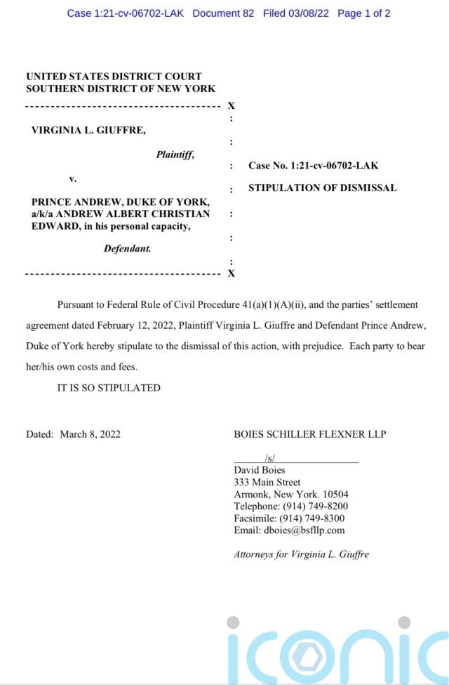 The legal document from Ms Giuffre and the duke’s legal team read: “Pursuant to Federal Rule of Civil Procedure 41(a)(1)(A)(ii), and the parties’ settlement agreement dated February 12 2022, Plaintiff Virginia L. Giuffre and Defendant Prince Andrew, Duke of York hereby stipulate to the dismissal of this action, with prejudice.