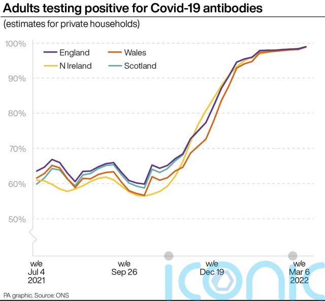 Some 99.0% of all adults in England were estimated to have Covid-19 antibodies at the start of March, up from 77.4% at the start of December 2021, the ONS found.