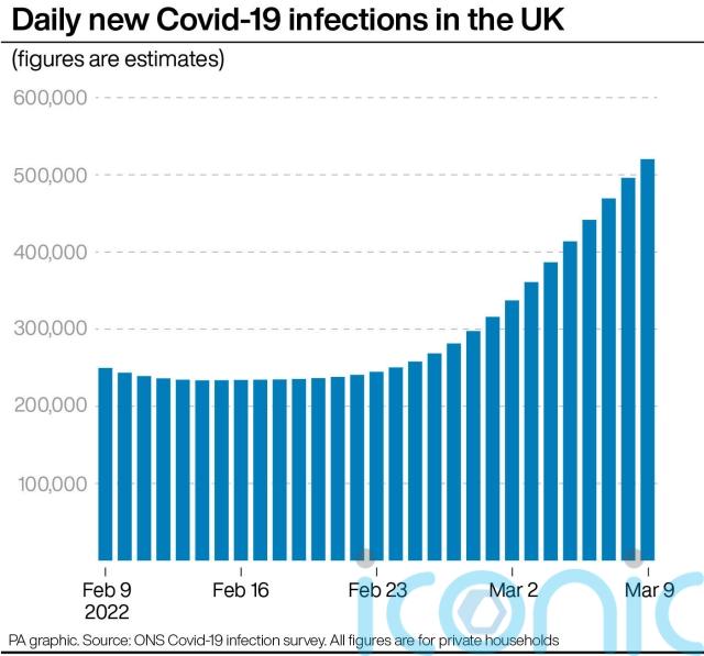 Infections are estimated to have more than doubled in the space of two weeks, from 244,600 per day by February 23 to 520,200 by March 9, according to new modelling published by the Office for National Statistics (ONS).
