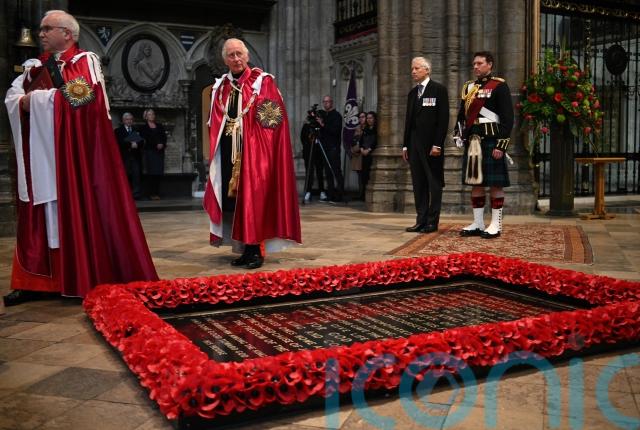 He entered the Abbey to a military band fanfare, standing by the poppy-wreathed grave of the Unknown Soldier as he was joined by the Knights and Dame Grand Cross.