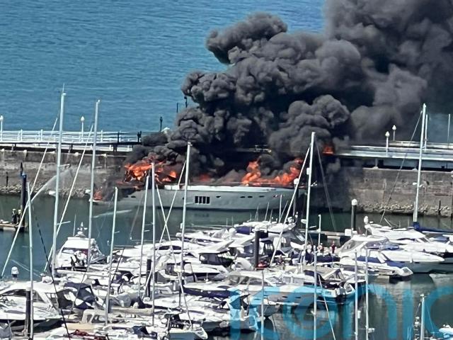Dramatic footage on social media showed thick plumes of black smoke billowing across the harbour and flames enveloping the boat.