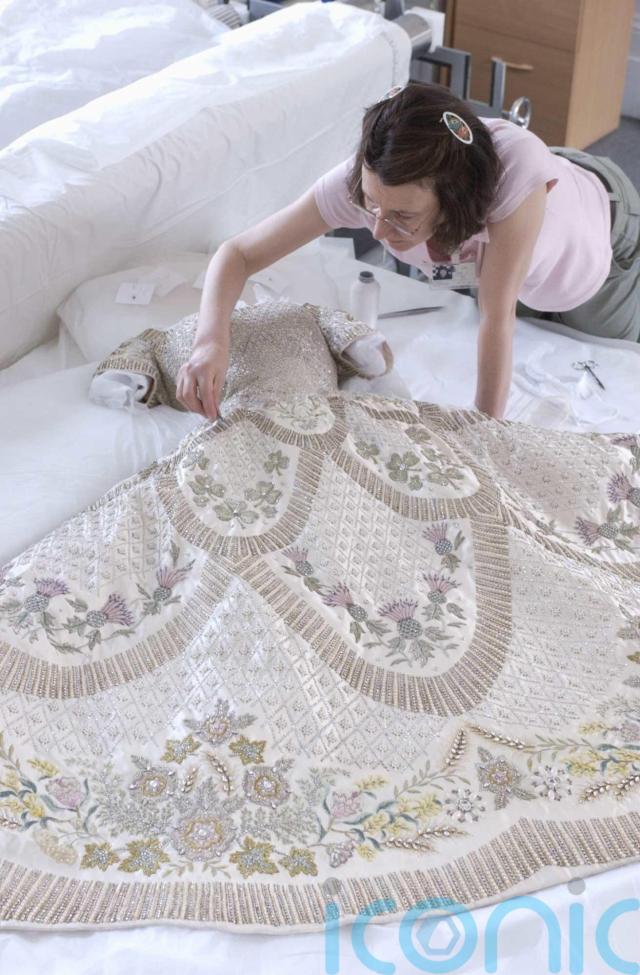 Embroidery in pastel-coloured silks depicted the emblems of the United Kingdom and countries of the Commonwealth.