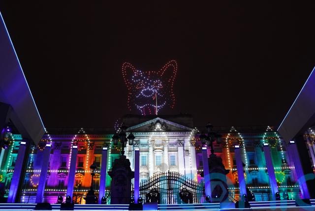 Drones flying over the Palace created a giant corgi in the sky and spelled out the message “Thank you Ma’am” in lights, thrilling concert goers.