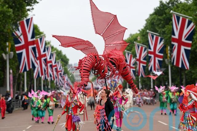 A cast of 6,000 performers took to the streets of central London, with the procession spared the rain.