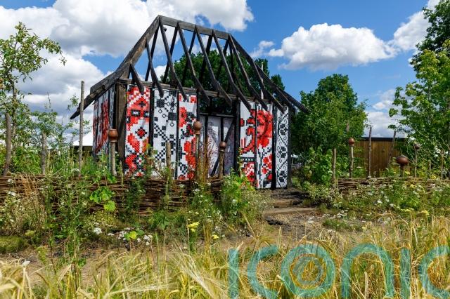 The garden includes the remains of a burnt-out cottage adorned with rushnyks, a traditional embroidered cloth, and features plants native to the country including barley, hollyhocks, field weeds and wild fruit trees.