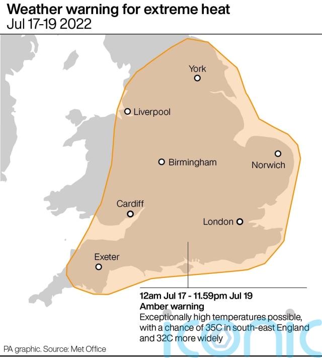 The Met Office has extended its amber warning for extreme heat for much of England and Wales, so it is now in place from Sunday until the end of Tuesday, with the hot spell expected to peak on Monday or Tuesday.