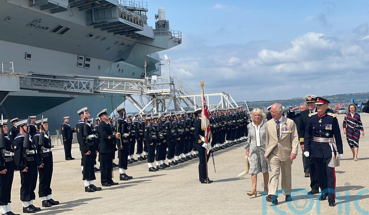 The couple were greeted by the president of the South Atlantic Medal Association 82 (SAMA82), Commodore Jamie Miller, and received the royal salute from a Royal Navy guard of honour accompanied by an army band on the jetty at Portsmouth Naval Base.