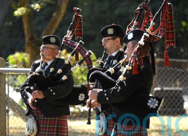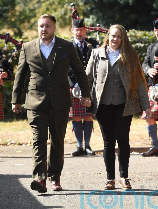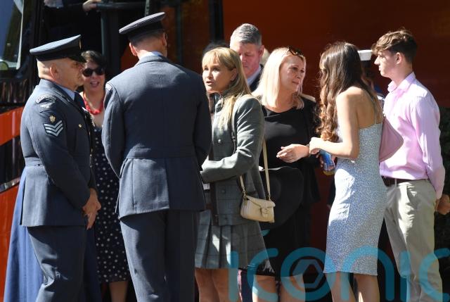 His mother Nicola Urquhart greeted mourners outside the church at RAF Honington, where he was stationed, as the City of Norwich Pipe Band played ahead of the service on Saturday.