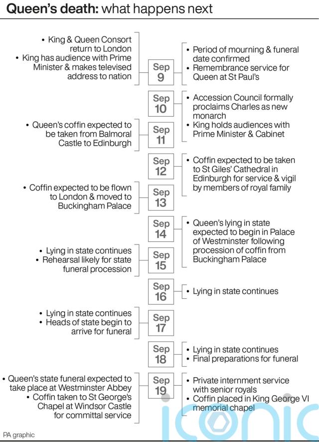 Buckingham Palace said in a statement: “Following the death of Her Majesty the Queen, it is His Majesty the King’s wish that a period of Royal Mourning be observed from now until seven days after The Queen’s Funeral. The date of the Funeral will be confirmed in due course.
