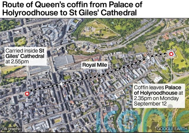 The Queen will be taken from the Palace of Holyroodhouse to nearby St Giles’ Cathedral where her family, and a congregation drawn from all areas of Scottish society, will attend a service of thanksgiving for her life.