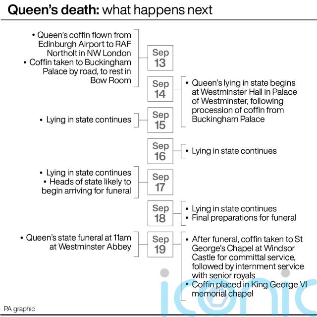 Those wishing to pay their respects will be able to file solemnly past the Queen’s coffin 24 hours a day from 5pm on Wednesday until 6.30am on the day of the funeral – September 19.