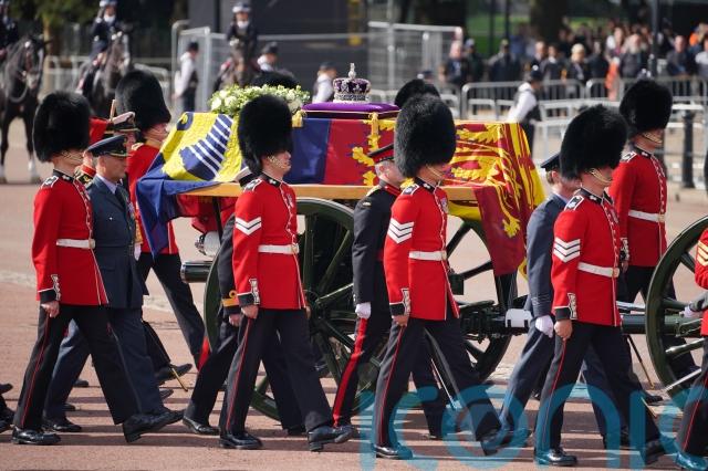Pulled on a gun carriage of The King’s Troop Royal Horse Artillery past silent crowds, the oak coffin was draped with a Royal Standard and adorned with the priceless, glittering Imperial State Crown.