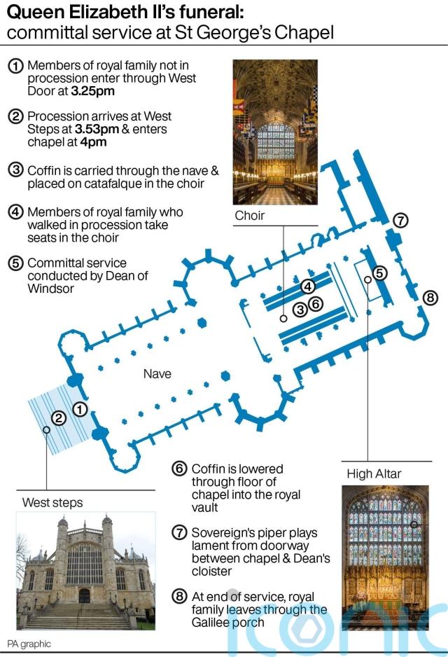 The procession, which will have been joined by the King and other family members on the north side of the quadrangle as it passes into Engine Court, will arrive at the West Steps of the chapel in Horseshoe Cloister at 3.53pm.