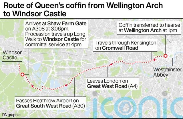 The hearse will approach Shaw Farm Gate in Albert Road, Windsor, and join the procession, which will have been formed up and in position to step off at 3.10pm.