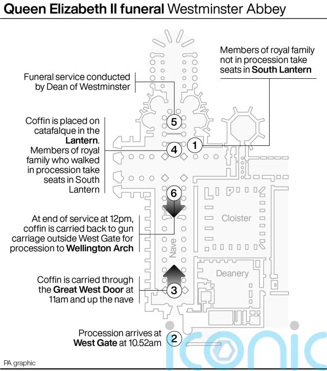 The Queen’s coffin will be carried back to the gun carriage before the procession steps off from Westminster Abbey at 12.15pm.