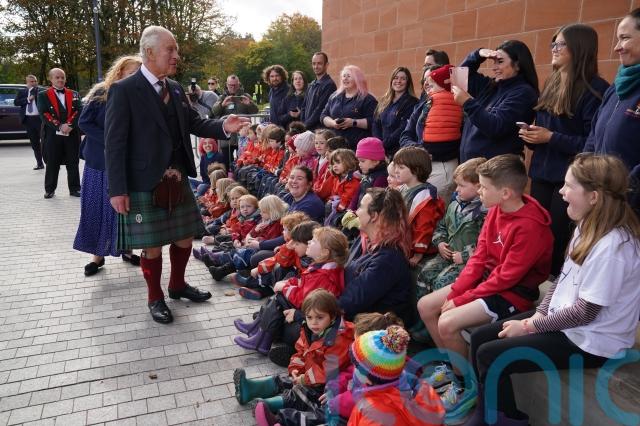 Dressed in Royal Stewart Hunting Tartan on his first official engagement in Glasgow as monarch, Charles looked delighted as he was presented with an autumnal wreath by local nursery children when he arrived at the Burrell Collection.