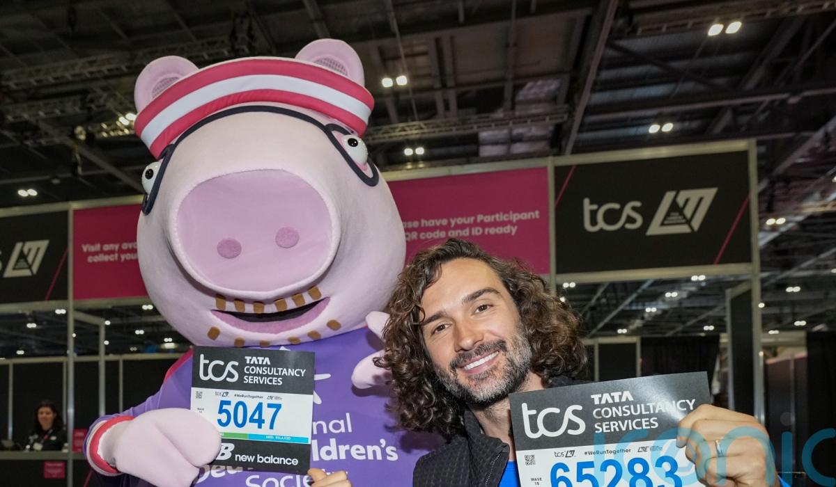 Fitness expert Joe Wicks was first in line to collect his bib number ahead of this weekend’s London Marathon – joined by children’s TV character Daddy Pig.