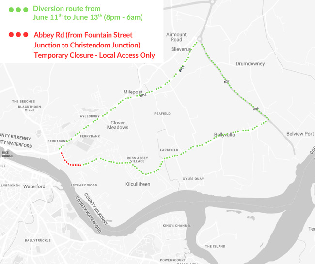 Waterford locals have been advised that Abbey Road in Ferrybank will be closed from Wednesday, 11 June to Friday, 13 June due to night time resurfacing works.