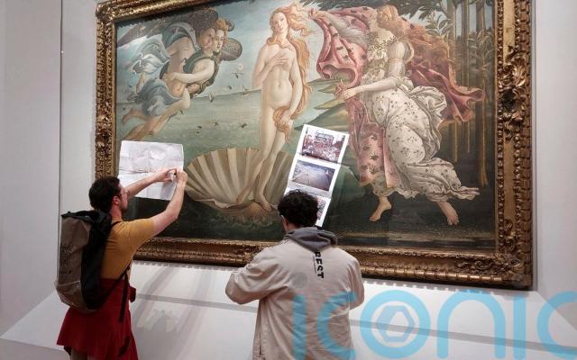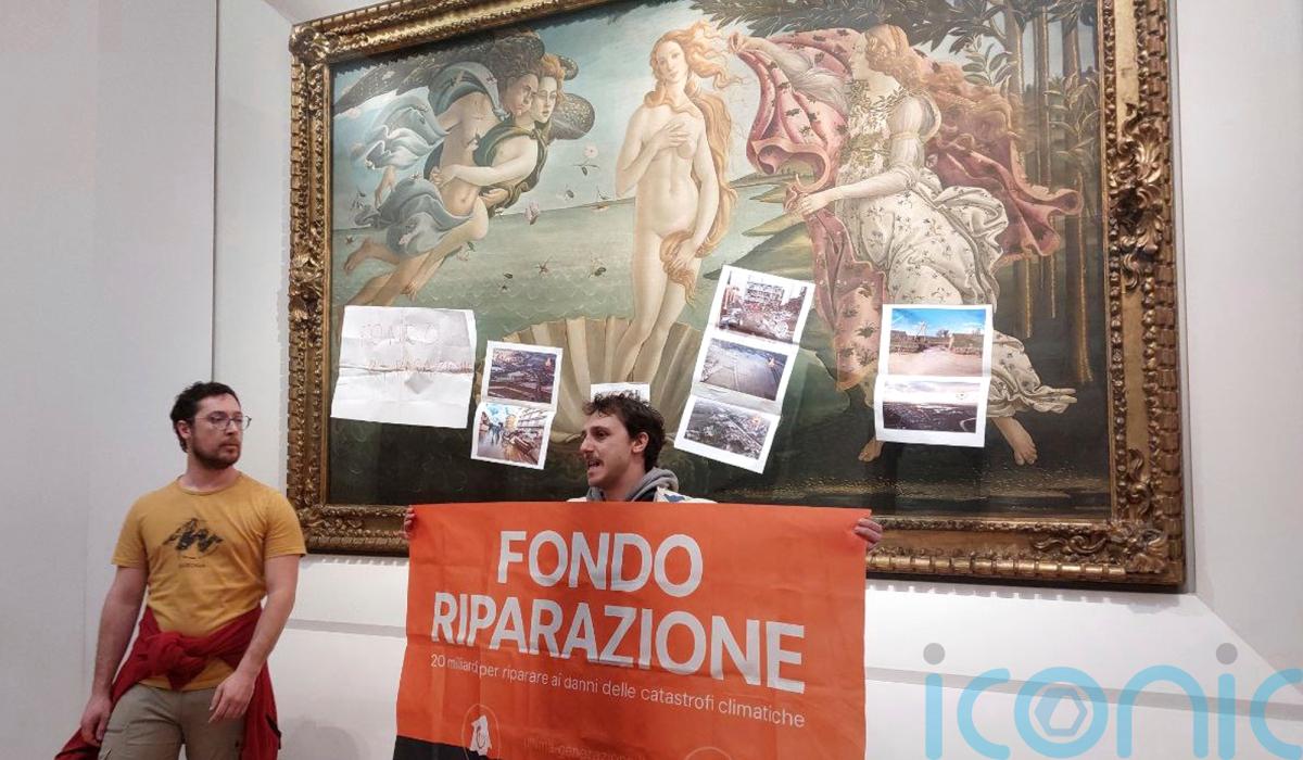 Two climate activists have targeted Botticelli’s masterpiece The Birth Of Venus at Florence’s Uffizi Gallery, attaching images of recent flood damage in the Tuscany region on the protective glass.