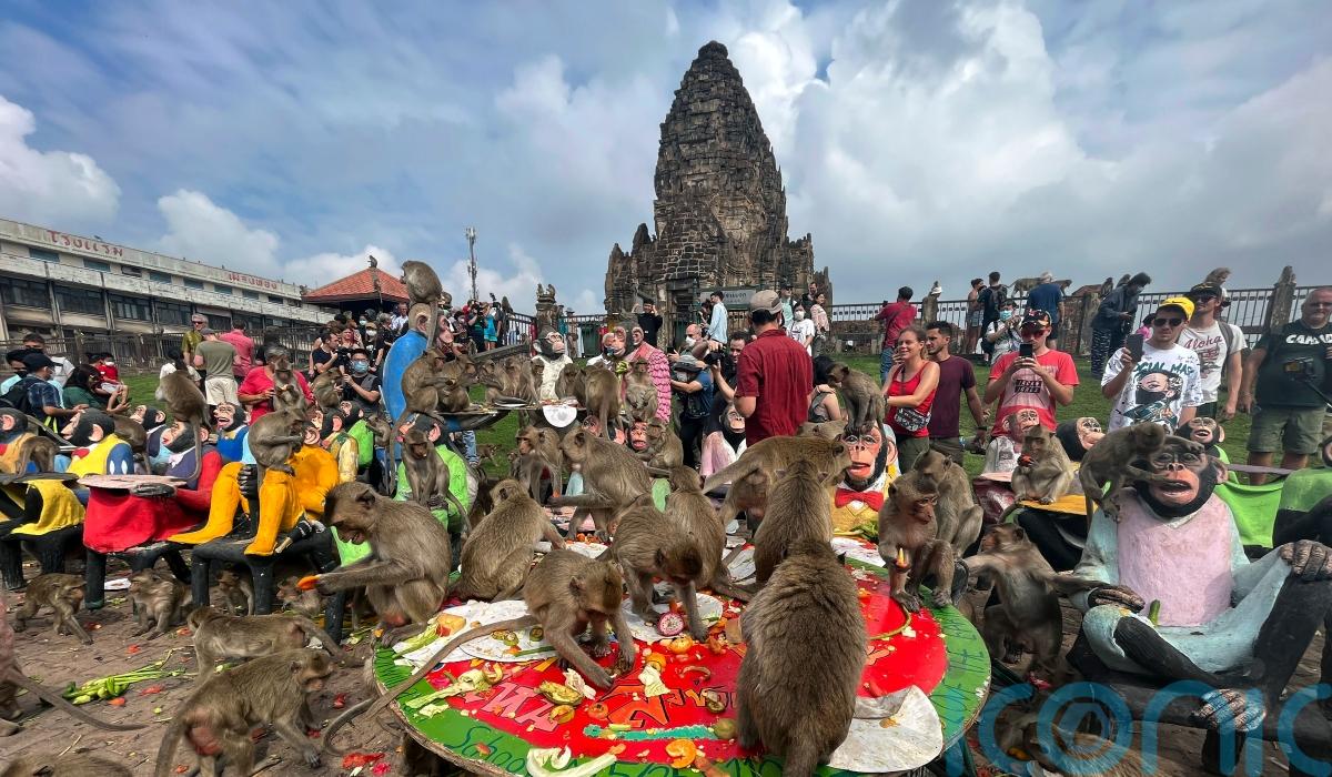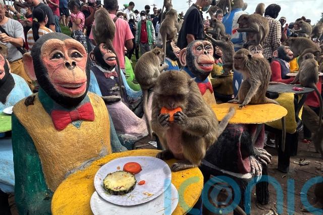 The monkeys are a symbol of the province, about 90 miles north of Bangkok, where the ancient Three Pagodas temple celebrates an annual Monkey Buffet festival, and they are commonly seen throughout the city. Macaques are classified as a protected species under Thailand’s wildlife conservation law.