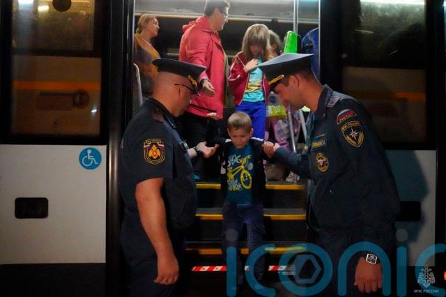 Volunteers were pictured distributing bags of aid, while officials from the country’s Ministry of Emergency Situations helped people, including children and the elderly, off buses.