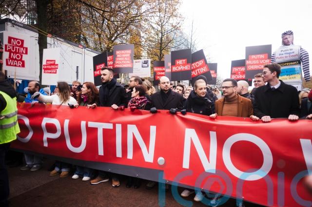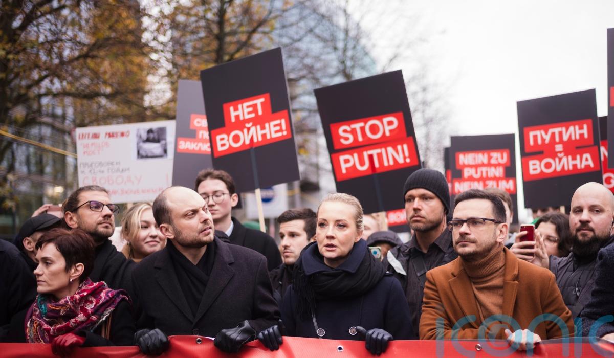 Behind a banner that read “No Putin, No War”, the protesters were led by Yulia Navalnaya, the widow of top Putin critic Alexei Navalny, as well as Ilya Yashin and Vladimir Kara-Murza, who were freed from Russian detention in a high-profile prisoner exchange this summer.