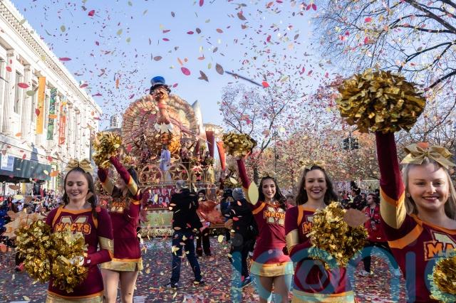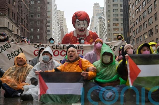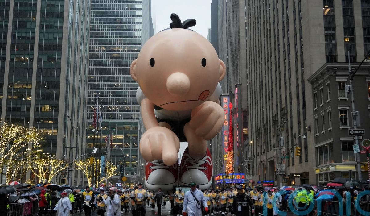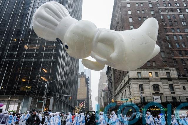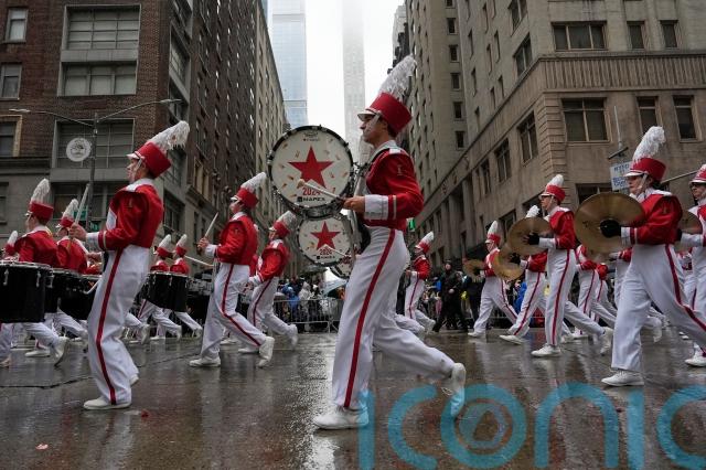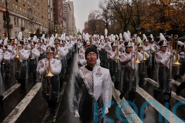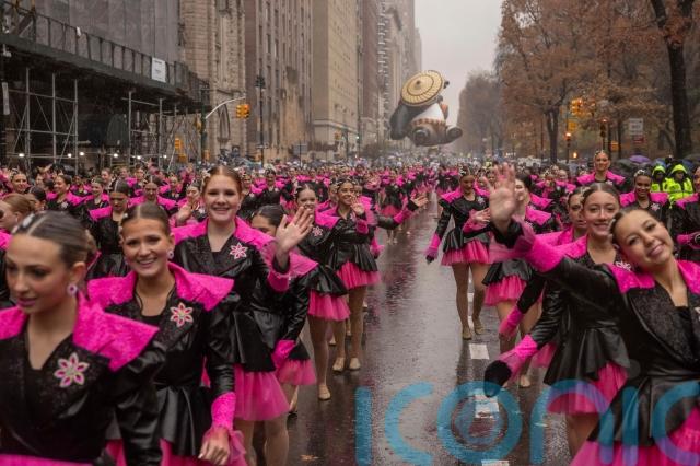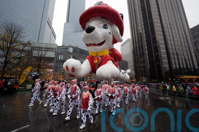 The Macy’s Thanksgiving Day Parade marched, soared and roared into its second century in New York on Thursday despite a drenching rain and a brief disruption from pro-Palestinian demonstrators.