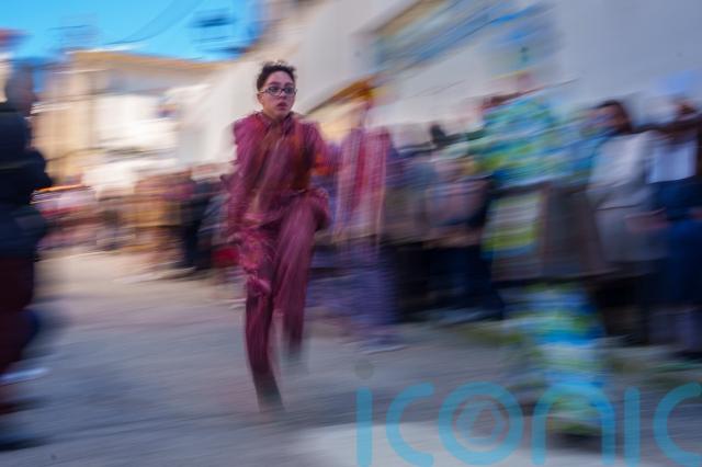 During the festival, men from the town dress up as devil-type characters with colourful jumpsuits and red mitre hats.