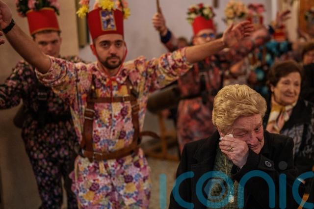 Donning large, heavy copper cowbells around their waists, which clang incessantly, the men walk, dance and jump through the town’s winding streets and visit the cemetery.