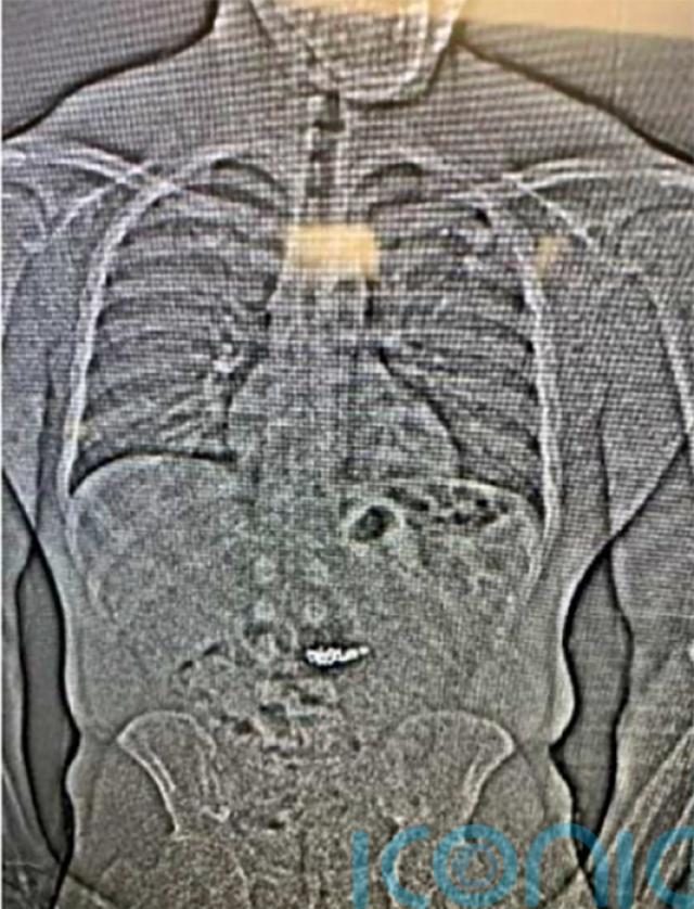 An X-ray of the suspect’s torso showed what the Orlando Police Department believed to be the diamond earrings — a white mass shining brightly against the grey backdrop of his digestive tract.