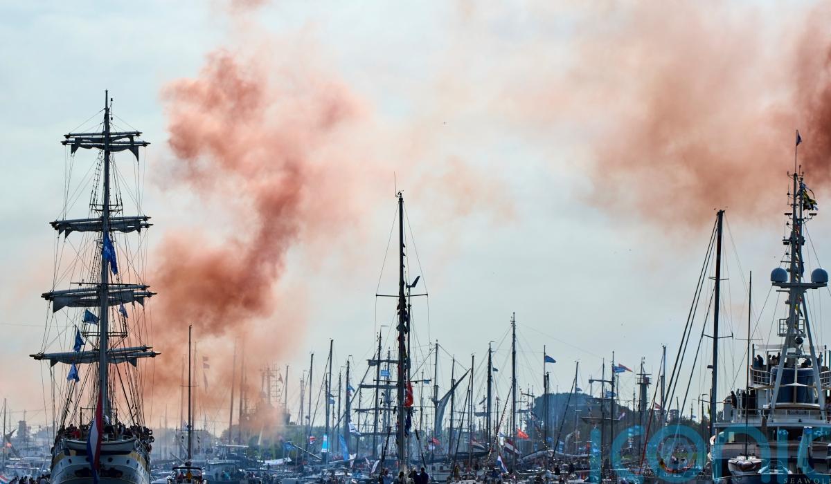 A puff of orange smoke erupted into the sky and ships’ horns sounded as the replica three-masted clipper Stad Amsterdam passed through a lock to mark the official start of the event.
