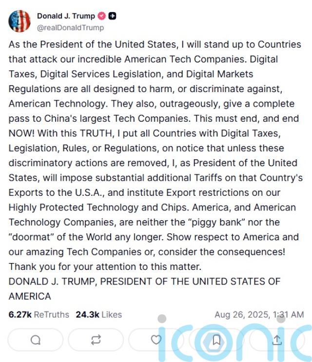 In a post on Truth Social late on Monday, Mr Trump said he would “stand up to countries that attack our incredible American Tech Companies”.