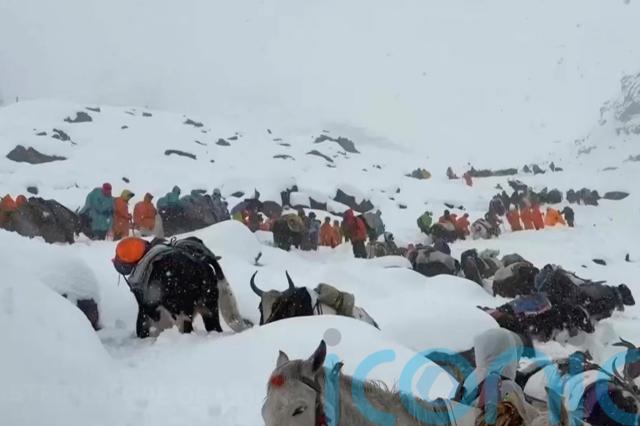 A video shot by a villager showed a long line of people with horses and oxen moving up a winding path in the snow.