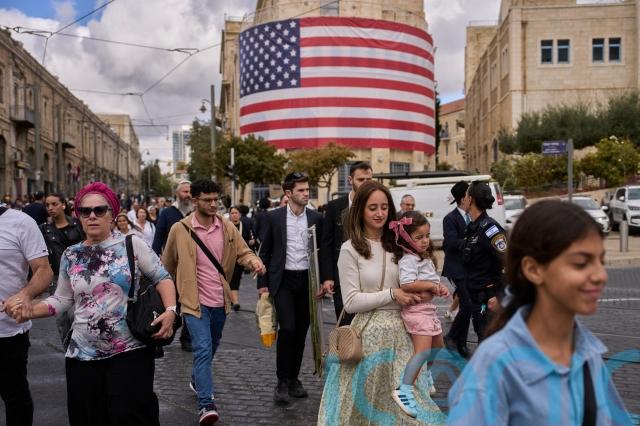 A giant US flag enveloped a building in Jerusalem’s City Hall complex, and US and Israeli flags were projected onto the Old City’s walls on Saturday night.