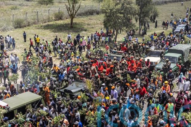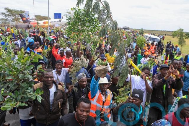 Later, crowds walked alongside the military vehicle carrying Mr Odinga from the runway while waving twigs.