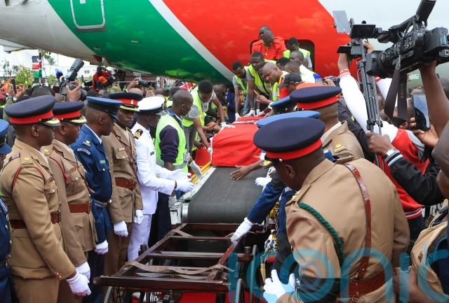 As the chartered plane with Mr Odinga’s body landed on Thursday morning in Nairobi, it was given a water cannon salute, with fire engines creating an arch of water over the aircraft.