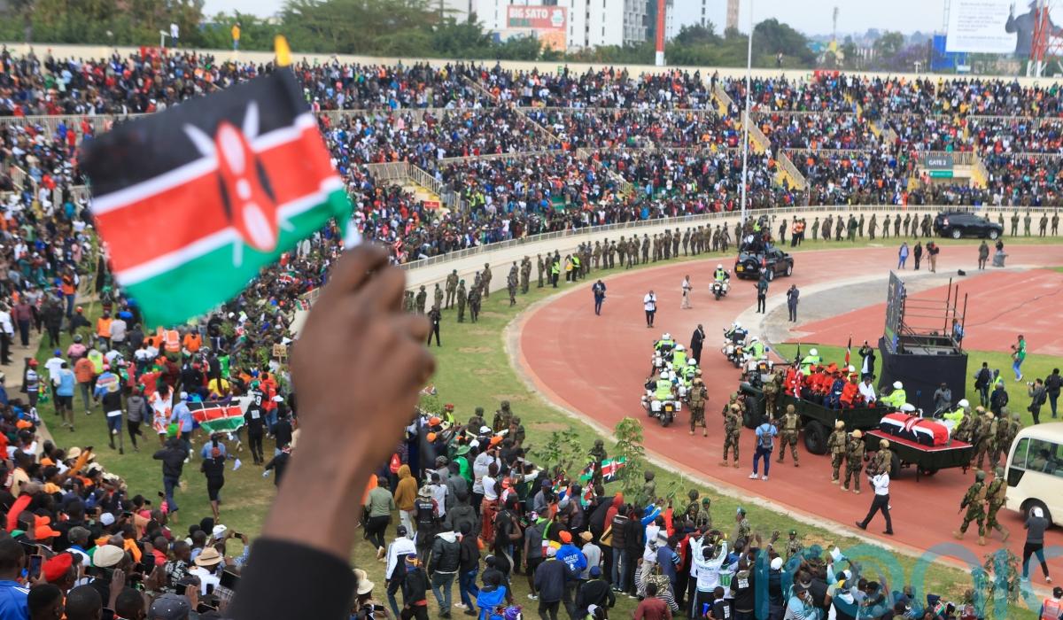 Thousands filled the stadium where Mr Odinga’s coffin was covered in the national flag for an Anglican Church service. They chanted and held up portraits of Mr Odinga, while some carried twigs, a symbol of peace and unity in Kenyan tradition.
