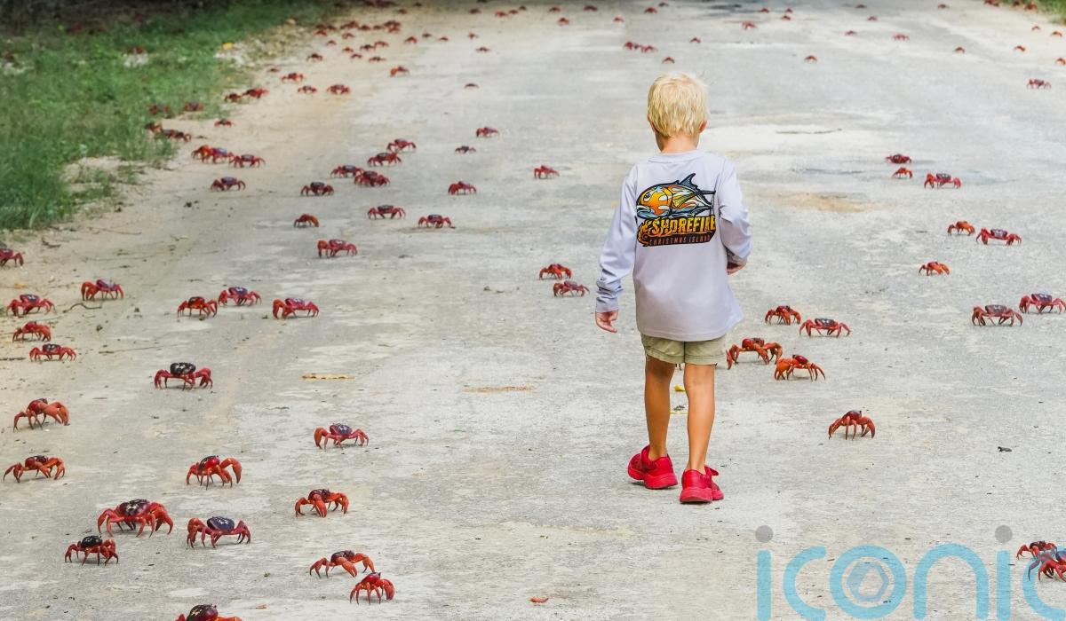 Tens of millions of red crabs are making their way to the ocean as part of their annual migration on Christmas Island, where a much smaller human population uses leaf blowers and garden rakes to help them on their way.