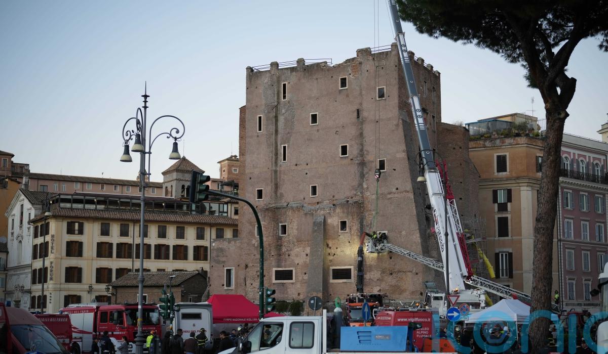 Firefighters have rescued a worker after hours trapped beneath rubble in a medieval tower that partially collapsed during renovation work in the heart of Italy’s capital.