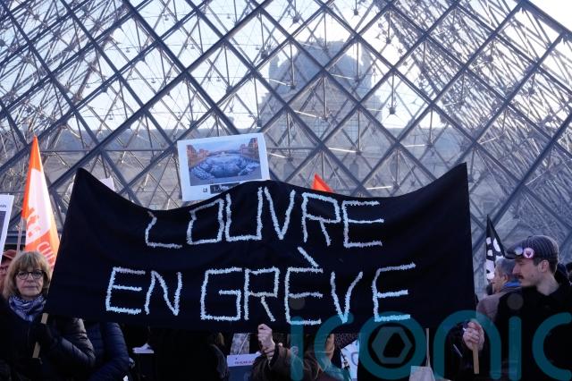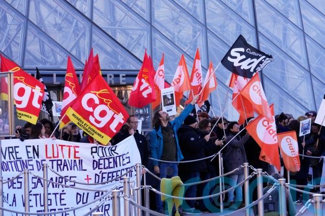 Striking workers with flags, banners and placards blocked the museum’s glass-pyramid entrance.