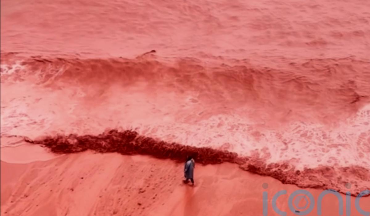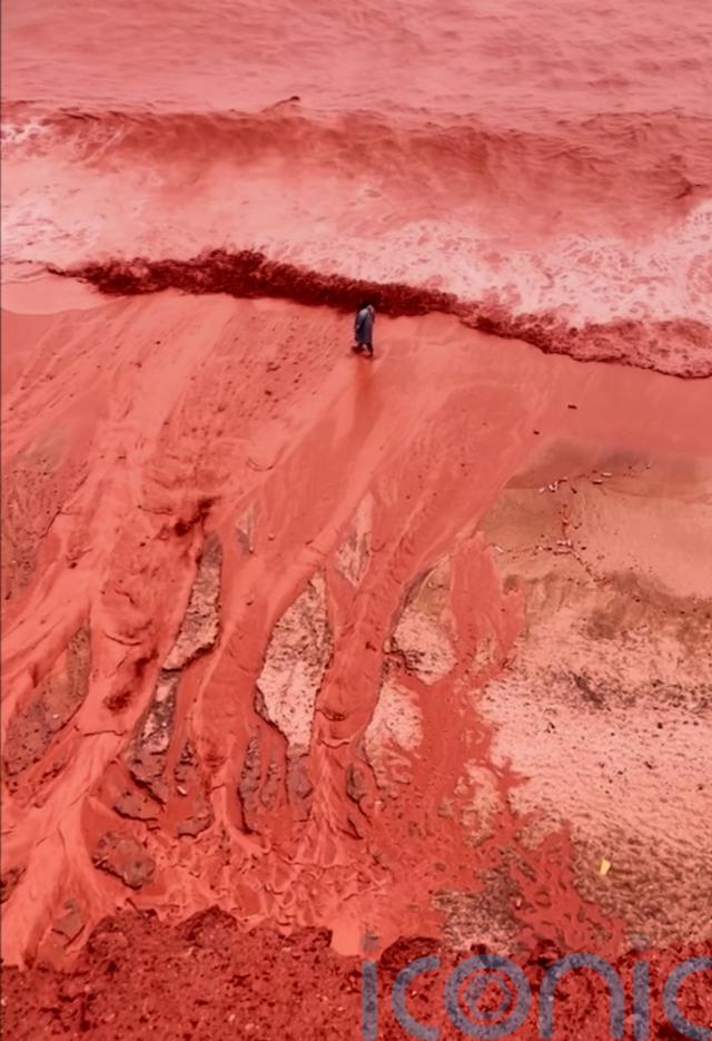 Rainfall on Iran’s Hormuz Island briefly transformed the coastline of its famed Red Beach into a striking natural scene this week, as red soil flowed into the sea and turned the water shades of deep red.