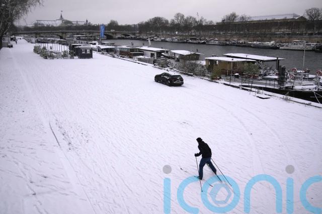 In Paris, a skier slid along the snowy bank of the Seine river and roads and parks around the Eiffel Tower and Louvre Museum were blanketed in snow, which also snarled traffic in parts of France, on Wednesday.