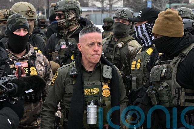 Gregory Bovino, a senior US Customs and Border Patrol official who has been the face of the crackdowns in other cities, walked along the long line of officers, looking at the crowd as protesters shouted at him, including a man who shouted: “Border Patrol should be along the border.”