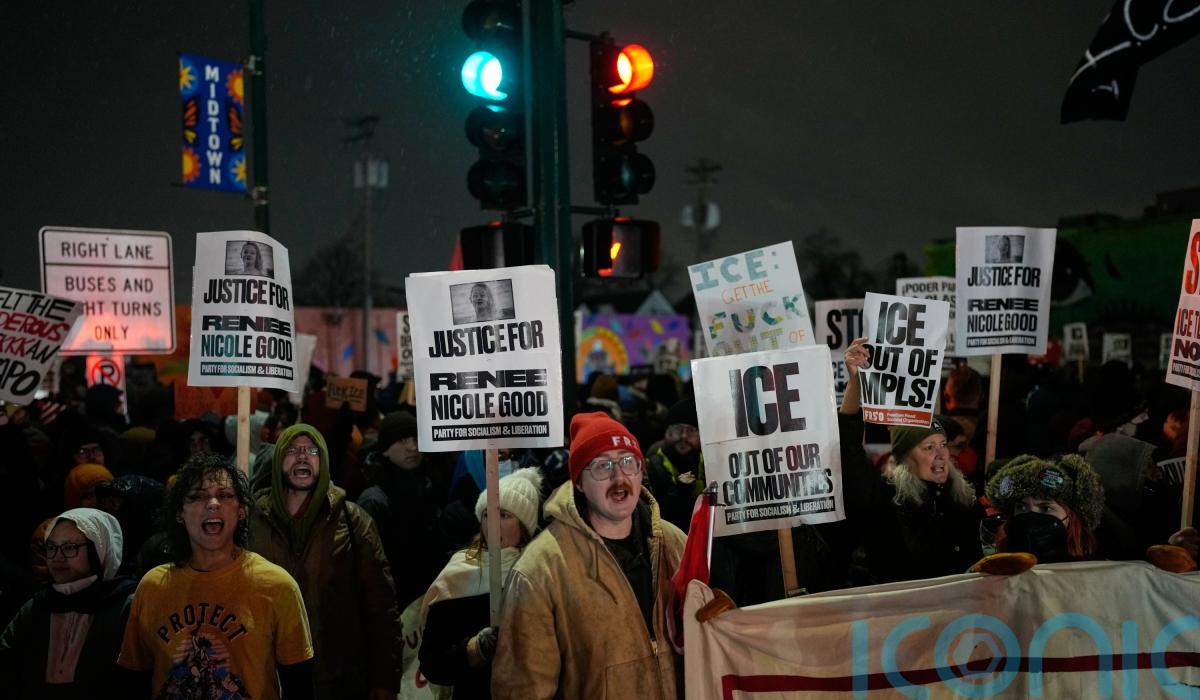 Hundreds of people protesting over the shooting of Renee Good marched in freezing rain on Thursday night, chanting “Ice out now” and holding signs saying, “killer ice off our streets”.