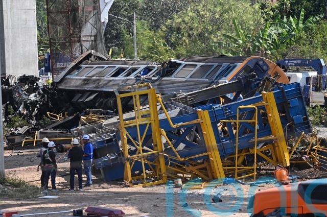 What appeared to be sections of the crane were scattered along the track. Meanwhile, paramedics gave first aid to injured passengers.