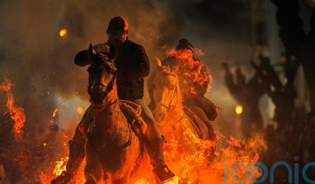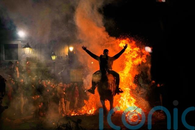 Riders guide horses through bonfires in the middle of the street in an act believed to purify the animals in the coming year.
