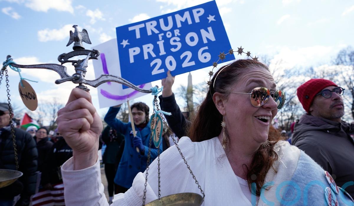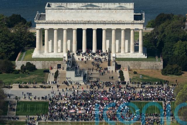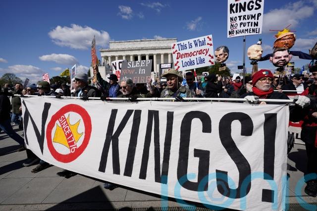 In Washington, hundreds of marchers moved through the streets, past the Lincoln Memorial and into the National Mall, holding signs that read “Put down the crown, clown” and “Regime change begins at home”.