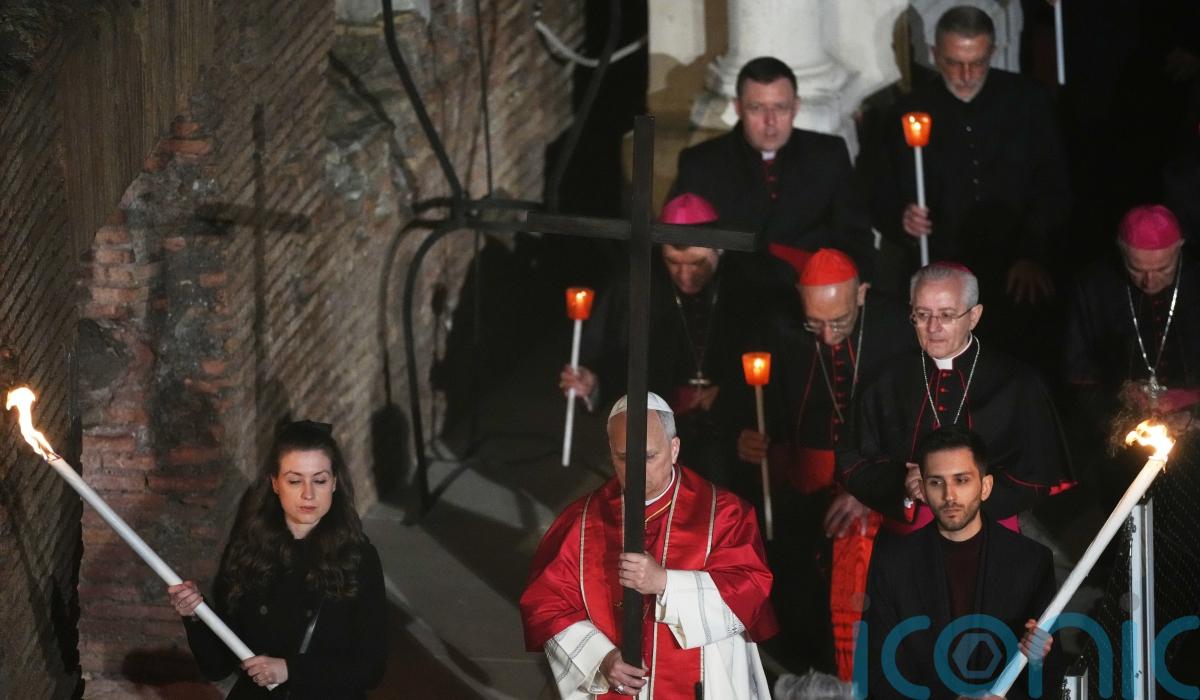 Inside the Colosseum in Rome, Leo lifted the cross and began the rite flanked by two torchbearers, who accompanied him throughout the hour-long procession from inside the Colosseum, through the crowd outside and up steep stairs to the Palantine Hill where he gave the final blessing.